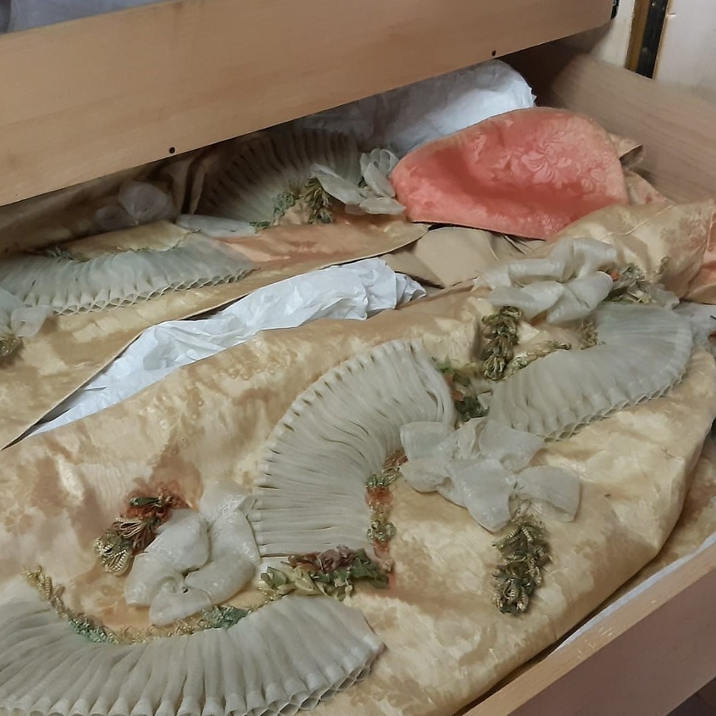 An unusual itinerary that leads from the exhibition rooms of the museum, where clothes, textiles, furnishings and works from the eighteenth century are on display, to the extremely rich storerooms on the second floor, in spaces that are not normally accessible to the public. Here are preserved the rarest, most delicate and precious textile artefacts in the collection. In these storerooms, it is possible to admire the sixteenth-century calcagnini, the high wedge shoes beloved of noblewomen and courtesans, the women’s and men’s dresses of eigtheenth-century Venice, such as the famous andrienne, the favourite style of dress of Venetian women of the time, or the marsine and sottomarsine worn by men, together with accessories such as the bauta, socks and bags. A unique and evocative experience that also allows you to understand how a museum works ‘behind the scenes’.
