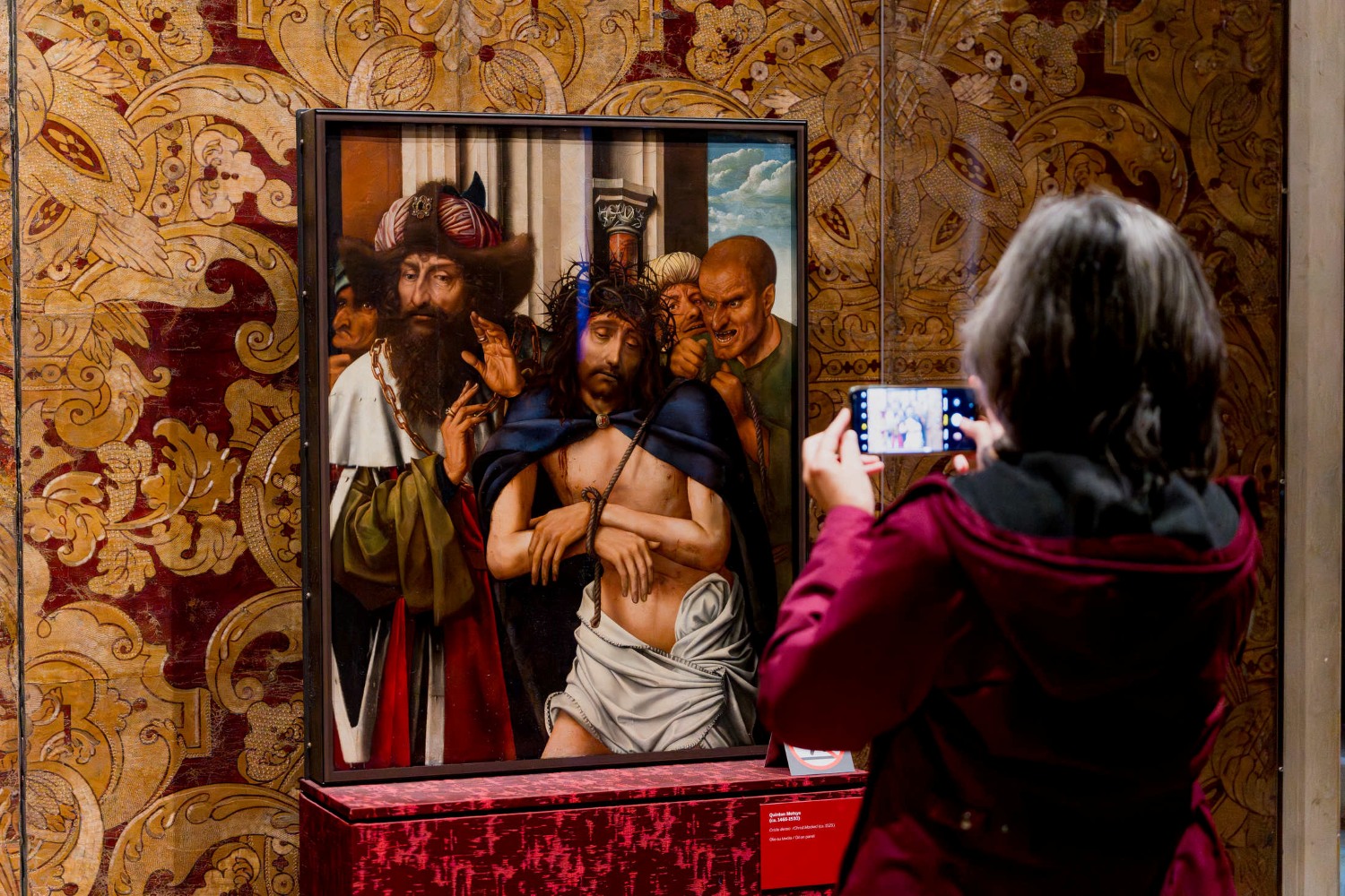 L’episodio raffigurato riprende il passo del Vangelo di Giovanni in cui Cristo, dopo la cattura, viene presentato alla folla con le parole “Ecce homo” ossia “Ecco l’uomo!”. Nel dipinto viene colto il momento in cui il corpo di Cristo è offerto, già emaciato e sofferente, dai suoi aguzzini alla folla. Dietro di lui, un uomo dai tratti aggressivi e violenti regge la corda che gli lega le mani. A sinistra di Gesù, riccamente abbigliato, è Ponzio Pilato: con il gesto delle mani intende comunicare la sua estraneità ai fatti, ma il suo sguardo tradisce il dubbio di aver condannato un uomo innocente.