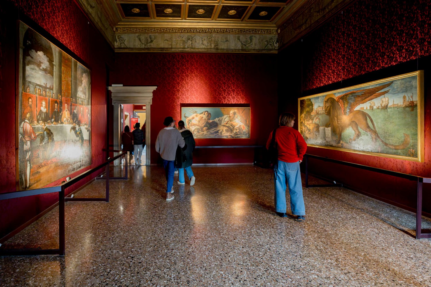 La grande tela di Vittore Carpaccio raffigura l’iconografia tipica del leone alato, simbolo di San Marco e, per estensione, della Serenissima. Il leone è rappresentato in posa “andante”, con le zampe posteriori sulla laguna e quelle anteriori sulla terraferma: chiaro riferimento all’estensione dell’impero veneziano, diviso in «stato de terra, stato da mar». Sullo sfondo è raffigurata una veduta di Venezia. Sulla sinistra vi sono i luoghi simbolo del potere veneziano: la Basilica di San Marco, la facciata di Palazzo Ducale e la Torre dell’Orologio, appena costruita; a destra, l’orizzonte si apre su un castello, forse evocazione dei “doi castelli” che presidiavano lo sbocco al mare, sull’isola di San Giorgio e sulle navi che salpano dalla Punta della Dogana, rappresentata prima del suo rivestimento in pietra d’Istria. Nel bacino di San Marco, protetta dall’ala del Leone, naviga la flotta mercantile e militare veneziana.