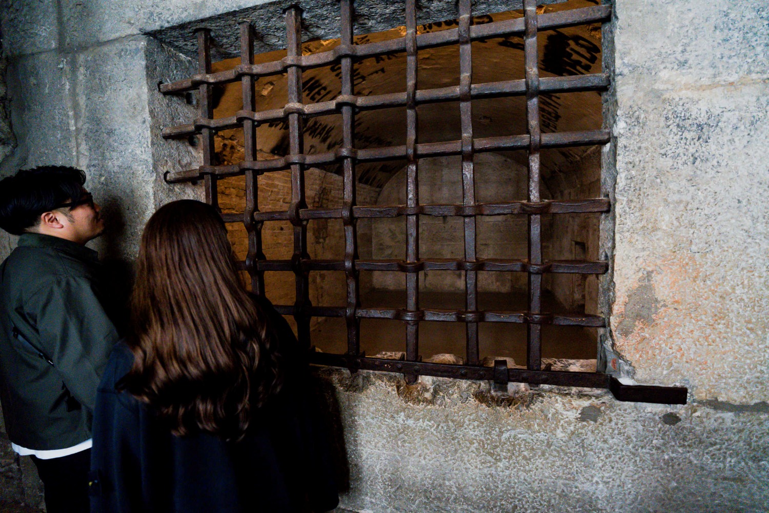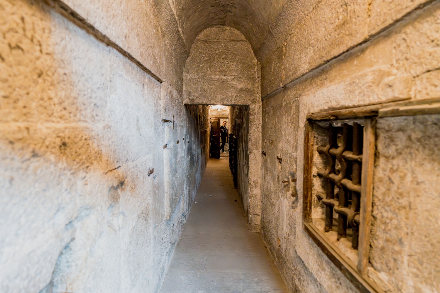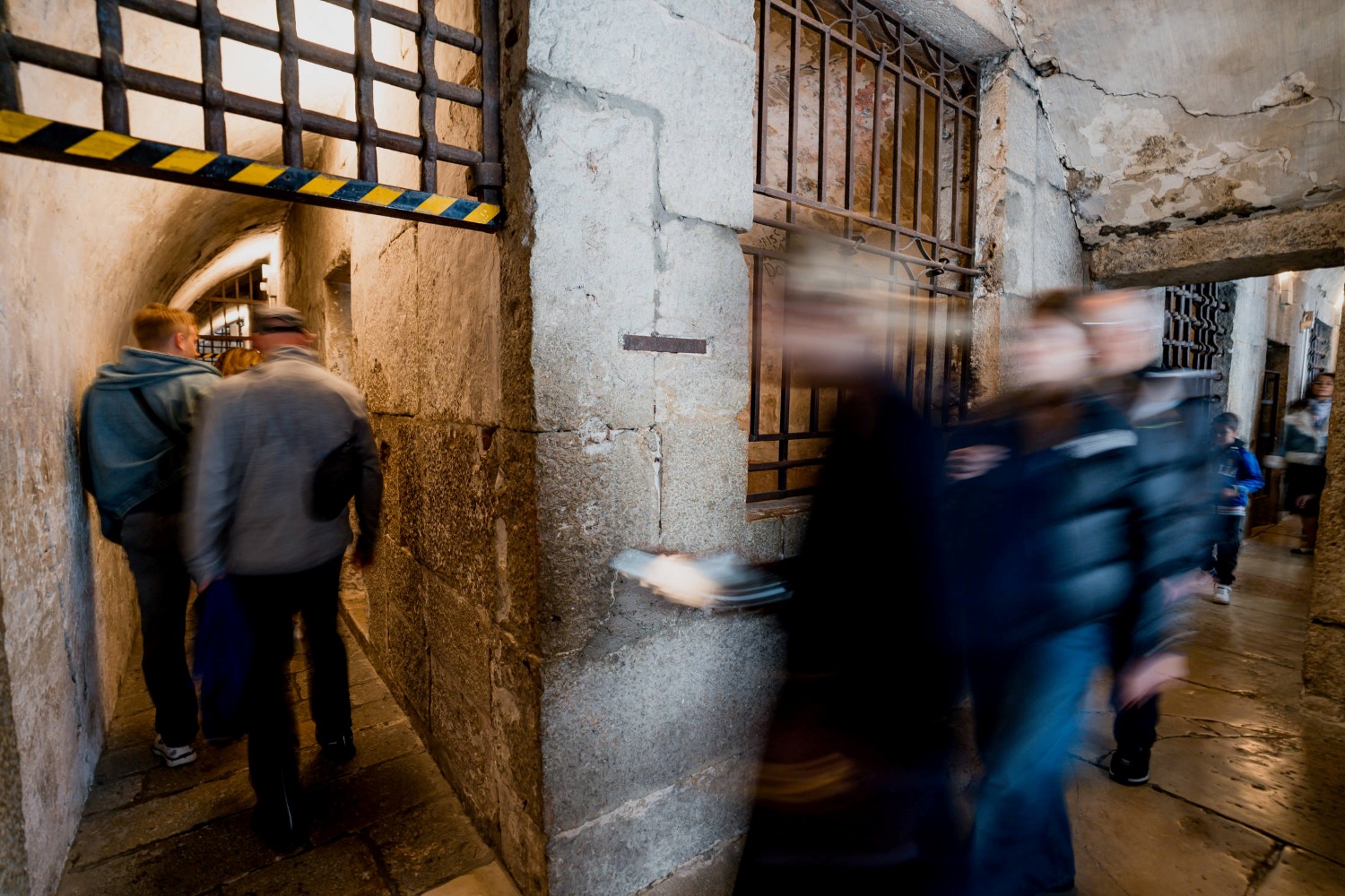 La visita alle Prigioni comincia con una piccola scala in discesa che dalla Sala del Magistrato alle Leggi conduce in uno stretto corridoio che non è altro che uno dei due attraversamenti del celebre Ponte dei Sospiri.