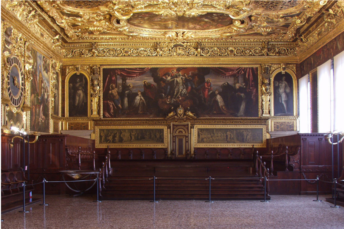 Tutte le stanze in cui si svolgevano funzioni connesse alla giustizia erano collegate tra loro in senso verticale, a partire dal piano terra, con le prigioni chiamate Pozzi, per proseguire poi al piano delle logge con l’Avogaria, al primo piano con le Quarantie e la sala del Magistrato alle Leggi, al secondo piano con le diverse sale con funzioni di tribunale – che stiamo ora visitando – fino alle prigioni del sottotetto, i Piombi.