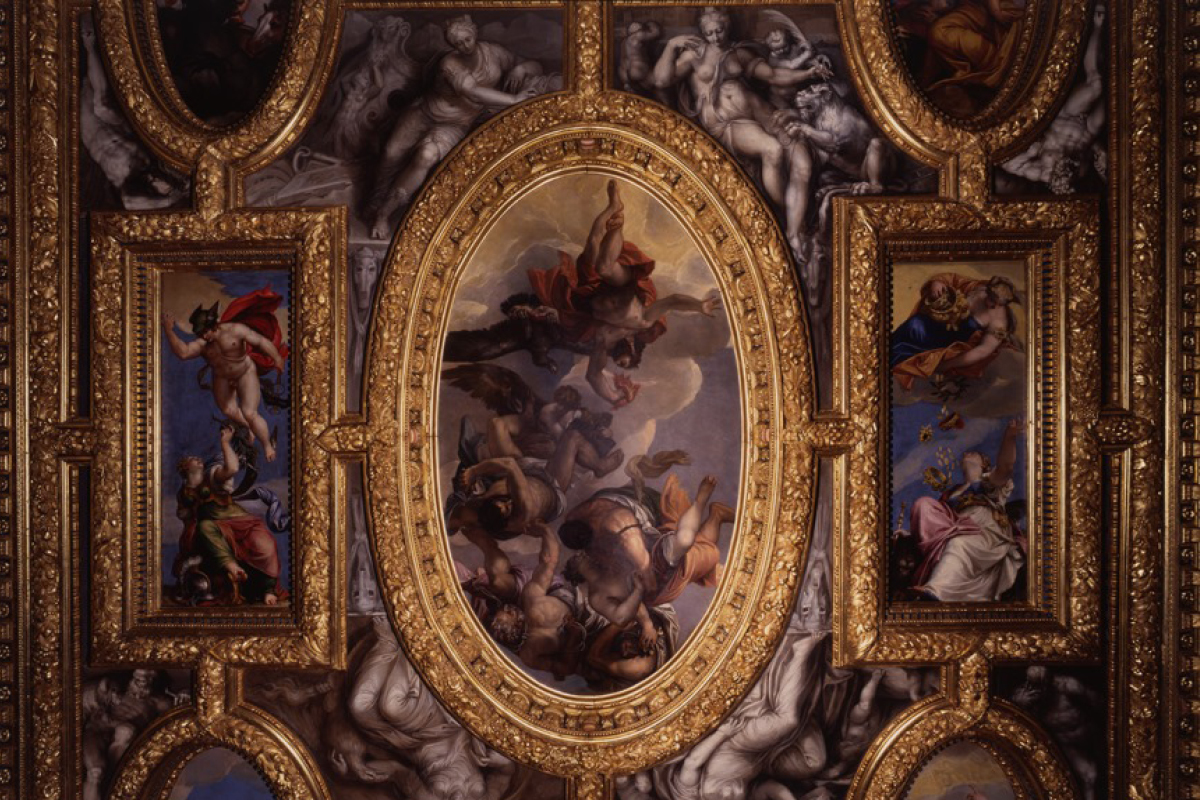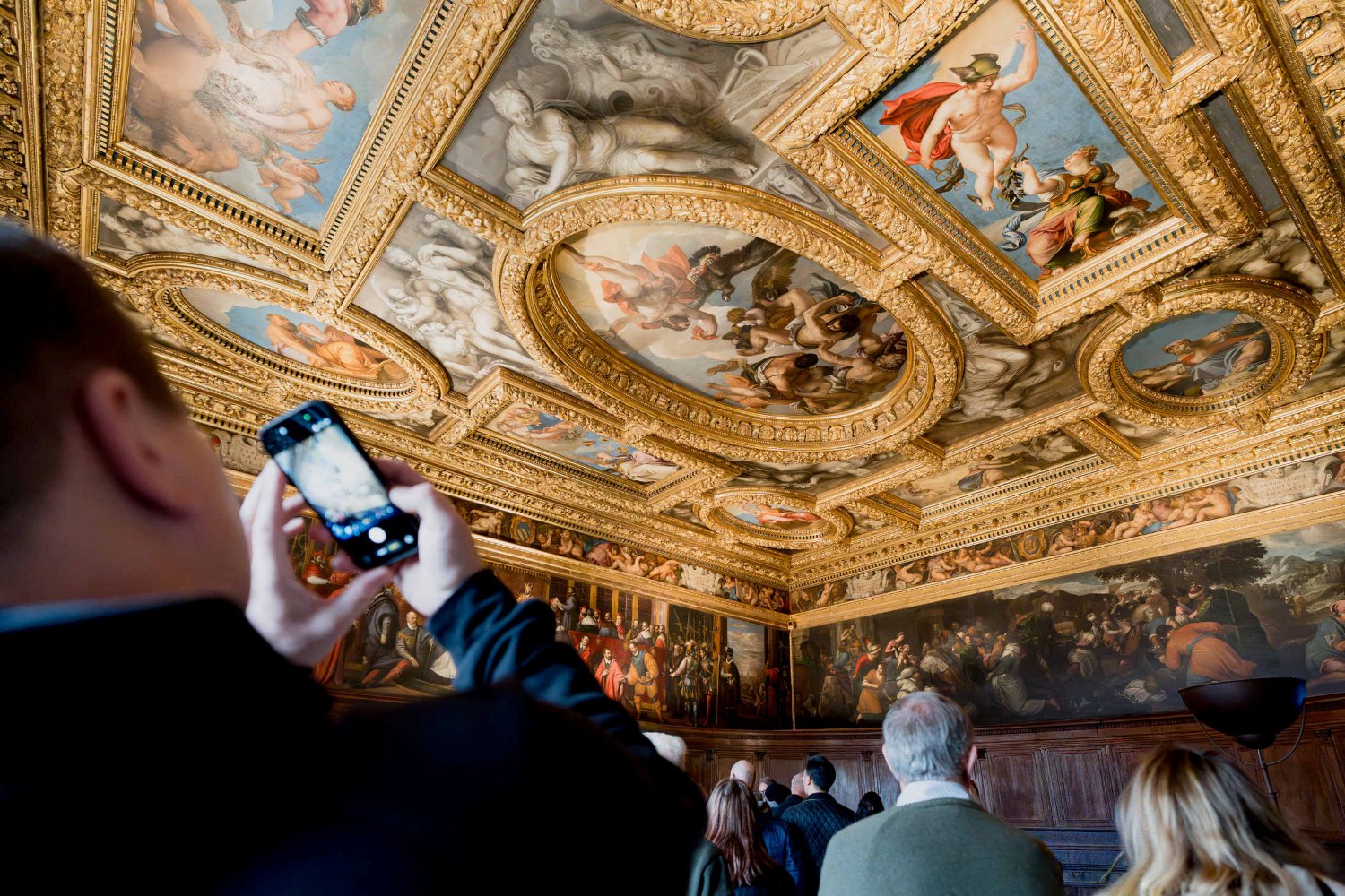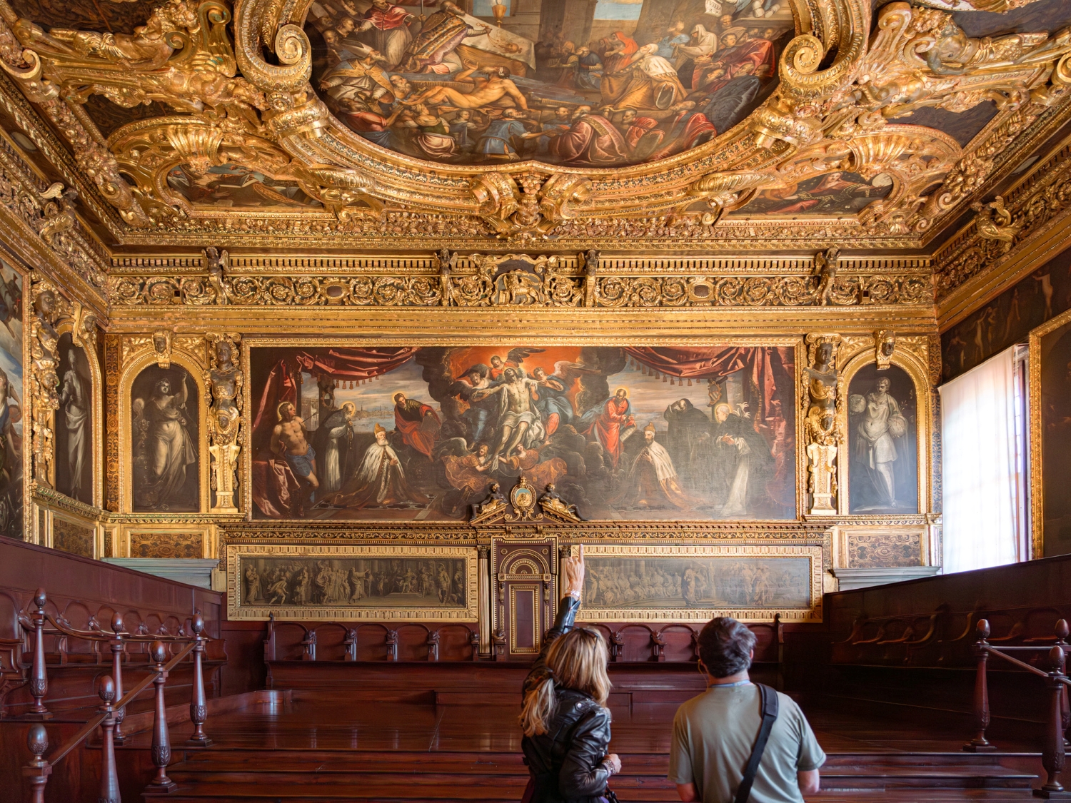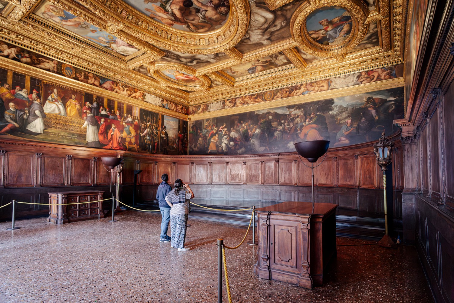 Segue la sala del Consiglio dei Dieci, creato per giudicare una congiura nel 1310, divenne un organo permanente con poteri che spaziavano dalla politica estera alla difesa dello Stato. La decorazione del soffitto, opera di Gian Battista Ponchino con Paolo Veronese e Gian Battista Zelotti, è divisa in venticinque scomparti con all’interno divinità e allegorie legate al potere del Consiglio. Celebri i dipinti di Veronese, dal Vecchio orientale a Giunone che sparge i suoi doni su Venezia, mentre l’ovale al centro con Giove che scende dal cielo a fulminare i vizi è una copia dell’originale portato al Louvre da Napoleone Bonaparte.