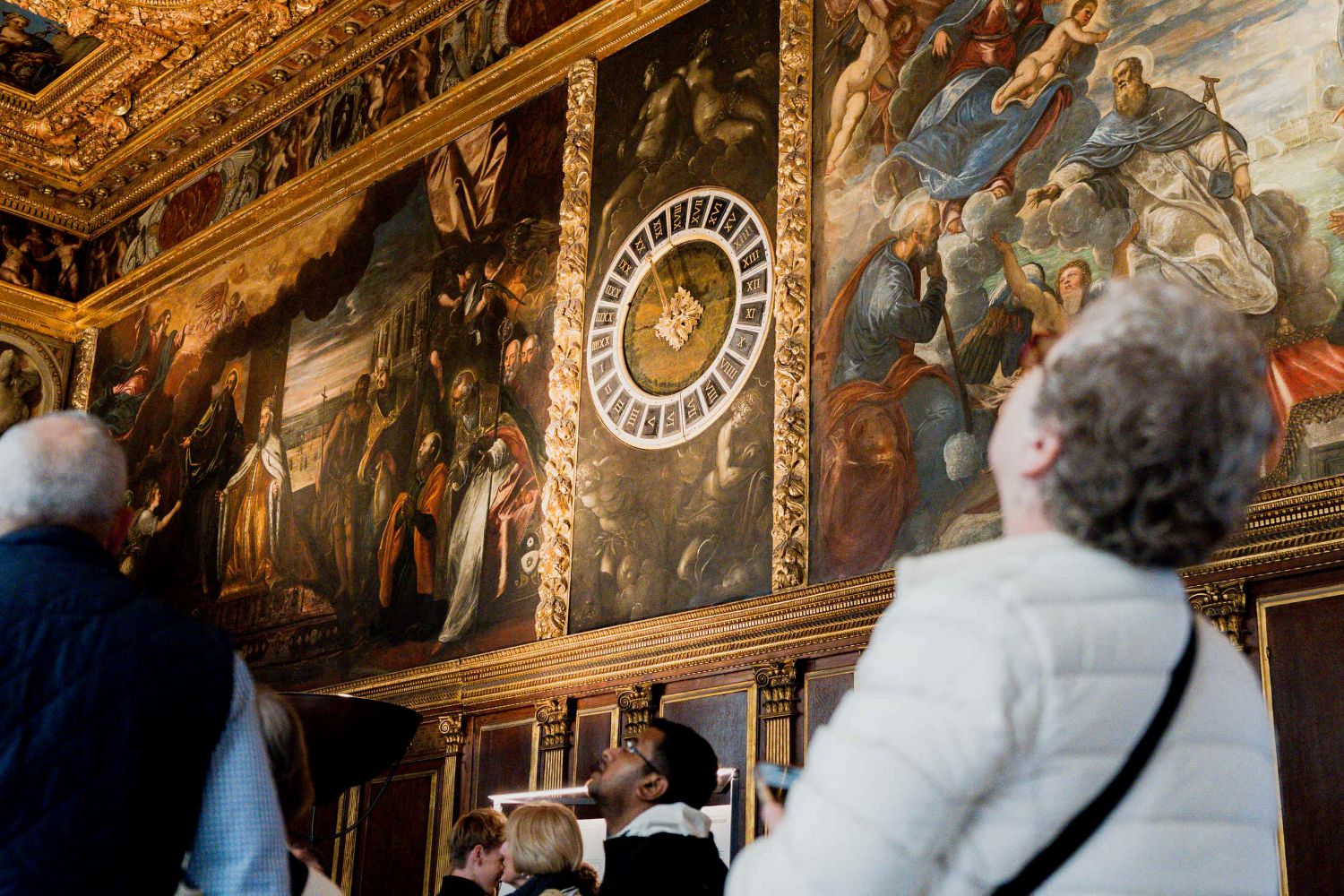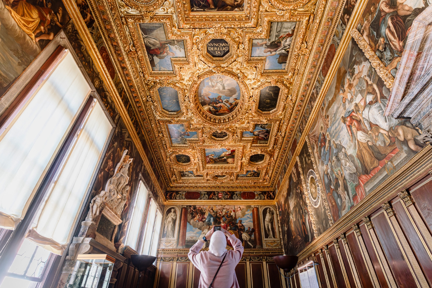 Inizia dalla sala della Bussola la serie degli spazi dedicati alle funzioni della Giustizia. Ed è appunto la statua della Giustizia che sormonta la grande bussola lignea che dà il nome alla stanza. La magnificenza della decorazione era mirata ad enfatizzare la solennità del rituale giuridico-politico dello Stato marciano. Il soffitto è decorato da Veronese, che ne completò la decorazione nel 1554 con opere volte all’esaltazione del “buon governo” della Serenissima.